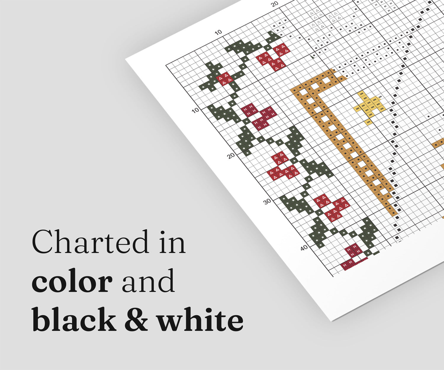 Pattern PDF includes the design charted in both color and black and white. Use the called for ThreadWorx and Gloriana silks, Weeks Dye Works, Classic Colorworks and DMC colors, stick to the included DMC conversion, or use your favorite colors from stash to bring this pattern to life.