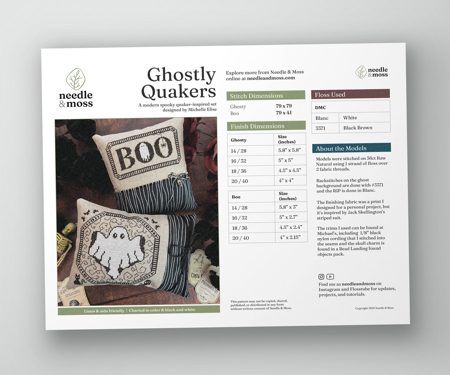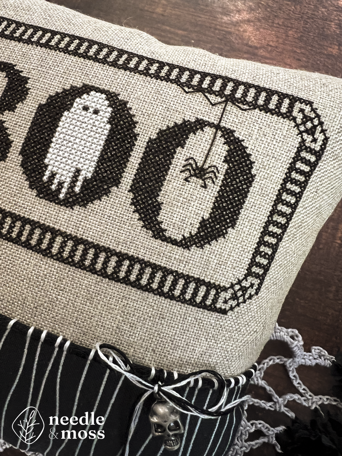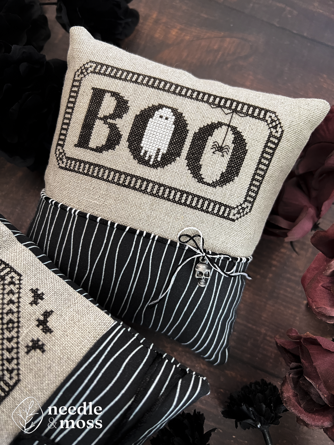 Pattern PDF includes the ghost and boo designs charted in both color and black and white. Use the called for DMC threads or use your favorite spooky colors from stash to bring these pillows to life.